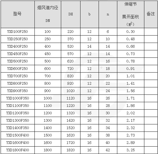 (2)YXDB800F250表示圓形非金屬補(bǔ)償器,長(zhǎng)期工作≤200°C,內(nèi)徑為DN800mm,法蘭連接補(bǔ)償器長(zhǎng)度250mm。
